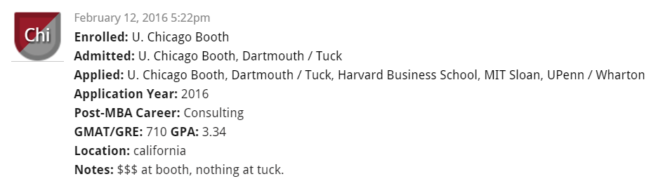 Money, of course, has made a difference in many decision-making processes. Here, Chicago Booth was the clear choice over Dartmouth’s Tuck School of Business when the former offered scholarship money and the latter did not.