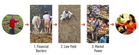 India’s economic growth over the past decade has resulted in greater consumer demand among affluent residents of urban centers for local, fresh produce. Demand for contract farming is growing as large supermarket chains are seeking to secure produce directly from growers. However, due to India’s highly fragmented agricultural sector, retail grocers are finding it difficult to secure a reliable supply of local, fresh produce. One need look no further than India’s smallholder farmer to understand the intractability of this problem: India’s smallholder farmers (those owning less than two hectares of farmland) comprise 78 percent of the country’s farmers.[1] Based on our research, these farmers face three primary barriers to accessing this attractive market (see graphic below):