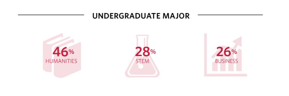 As far as undergraduate backgrounds are concerned, we note some interesting variety between the schools. At Wharton, 46 percent of the class majored in humanities in college, up from 42 percent the year before. STEM students (those with science, technology, engineering or math undergraduate backgrounds) also gained some ground, rising to 28 percent from 25. Business undergraduates, for their part, fell to 26 percent from 29 percent.