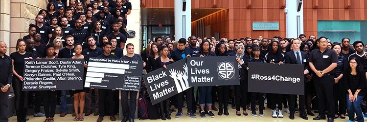 Standing together on the afternoon of Monday, September 26th, dressed in all black, the group unified behind signs of Black Lives Matter and #Ross4Change, sending a powerful, cohesive message. The moment was organized by the Black Business Student Association and the Student Government Association at Ross, which is also helping put together a Kickstarter campaign championing diversity.