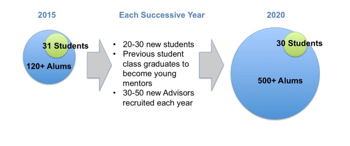“As we originally began designing this as a mentorship program, we thought about a one-on-one. What we heard from both sides was that a one-on-one relationship is really difficult,” she told ExitEvent. “Generally, you don’t have one advisor in your life. We wanted to help those students build a personal board of advisors.”
