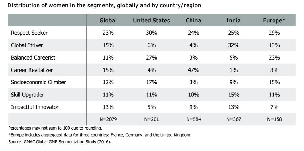 “It’s easy to make the mistake of thinking of women as a monolithic block and to view their lack of parity in MBA classrooms as a failure on the part of business schools,” GMAC President and CEO Sangeet Chowfla says. “The insights in this white paper clearly reveal that women are distinct from men in what they are seeking from their business education experience, and their behaviors differ between countries and behavior types.”
