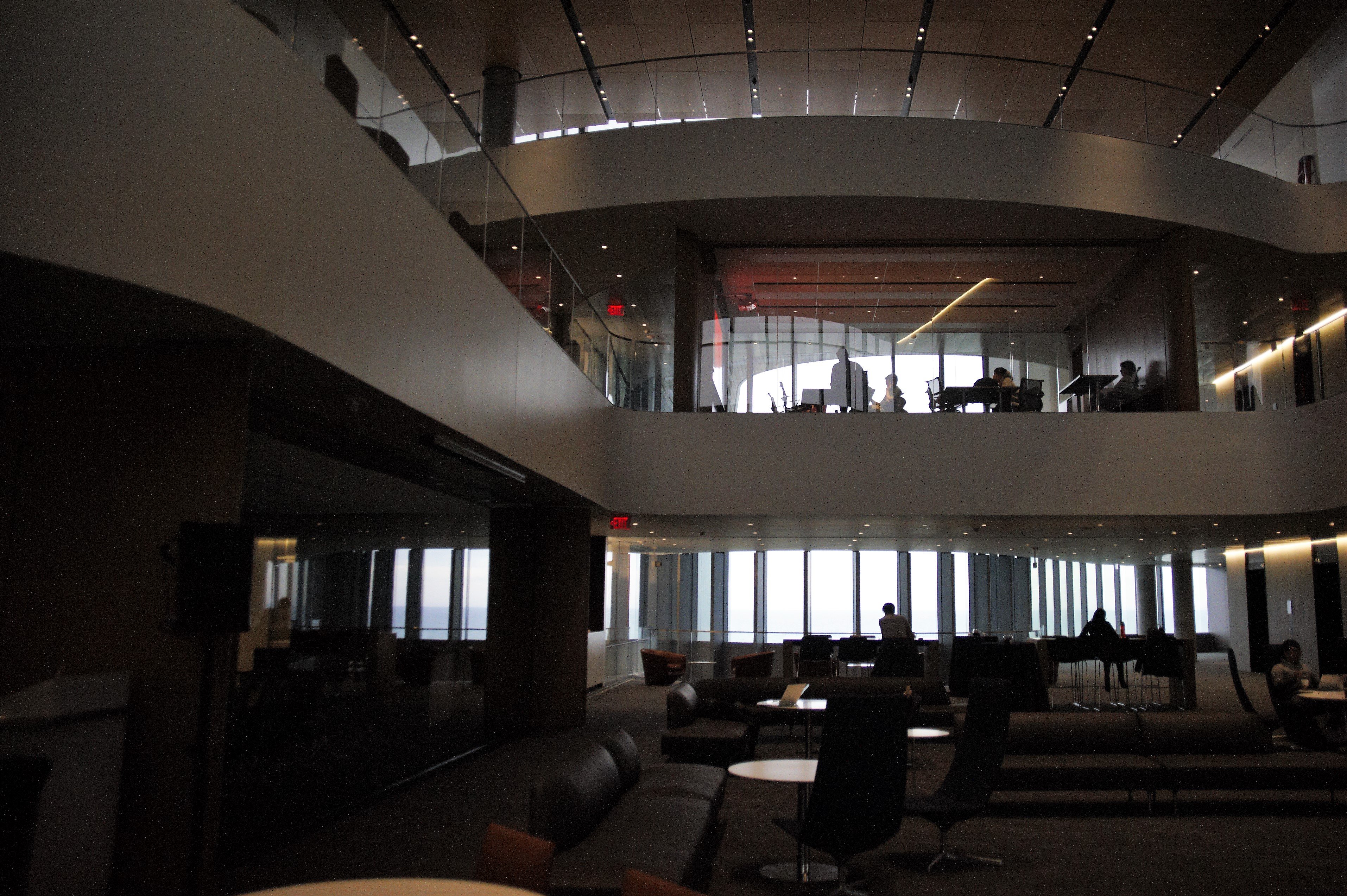 “Another thing the architects had a very deft hand with was warming up large spaces,” explains Leann Paul, an architect and consultant who since 2010 has helped manage the construction project on behalf of Kellogg. This was achieved in part through the incorporation of lots of wood, but also through the building’s design. Its four quadrants all meet in the center, which is actually two stacked atriums, she continues. The lower atrium—Collaboration Plaza—connects the lower level, first and second floors. Above that is a second atrium connecting all the quadrants for the faculty floors. Called the “Faculty Summit,” this upper atrium provides a second crossroads within the building, occasioning the same types of collaboration-fostering intersections and interactions between faculty members that Collaboration Plaza does below.