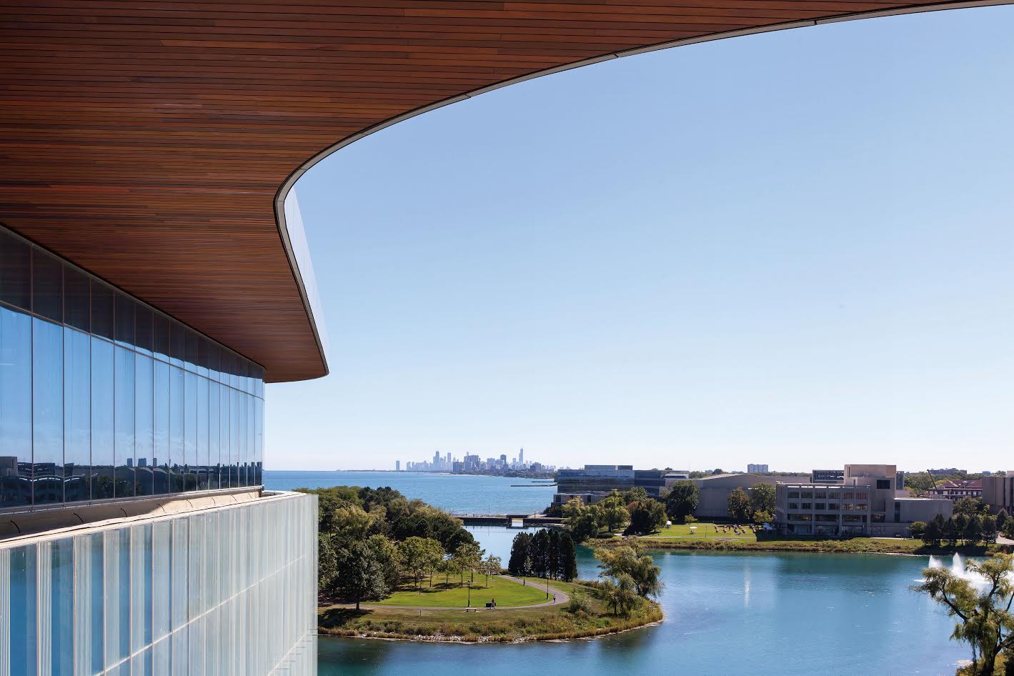 Crossing a bridge connecting the quadrants on the uppermost floors truly feels like walking on air—and spectacular views abound in all direction. Facing the question of who to put in the area spanning the two south quadrants—prime real estate with its birds-eye view of Chicago’s iconic skyline—Kellogg opted to make it an emeritus faculty suite. “Who better to get that space, with its great views in and out?” says Paul.