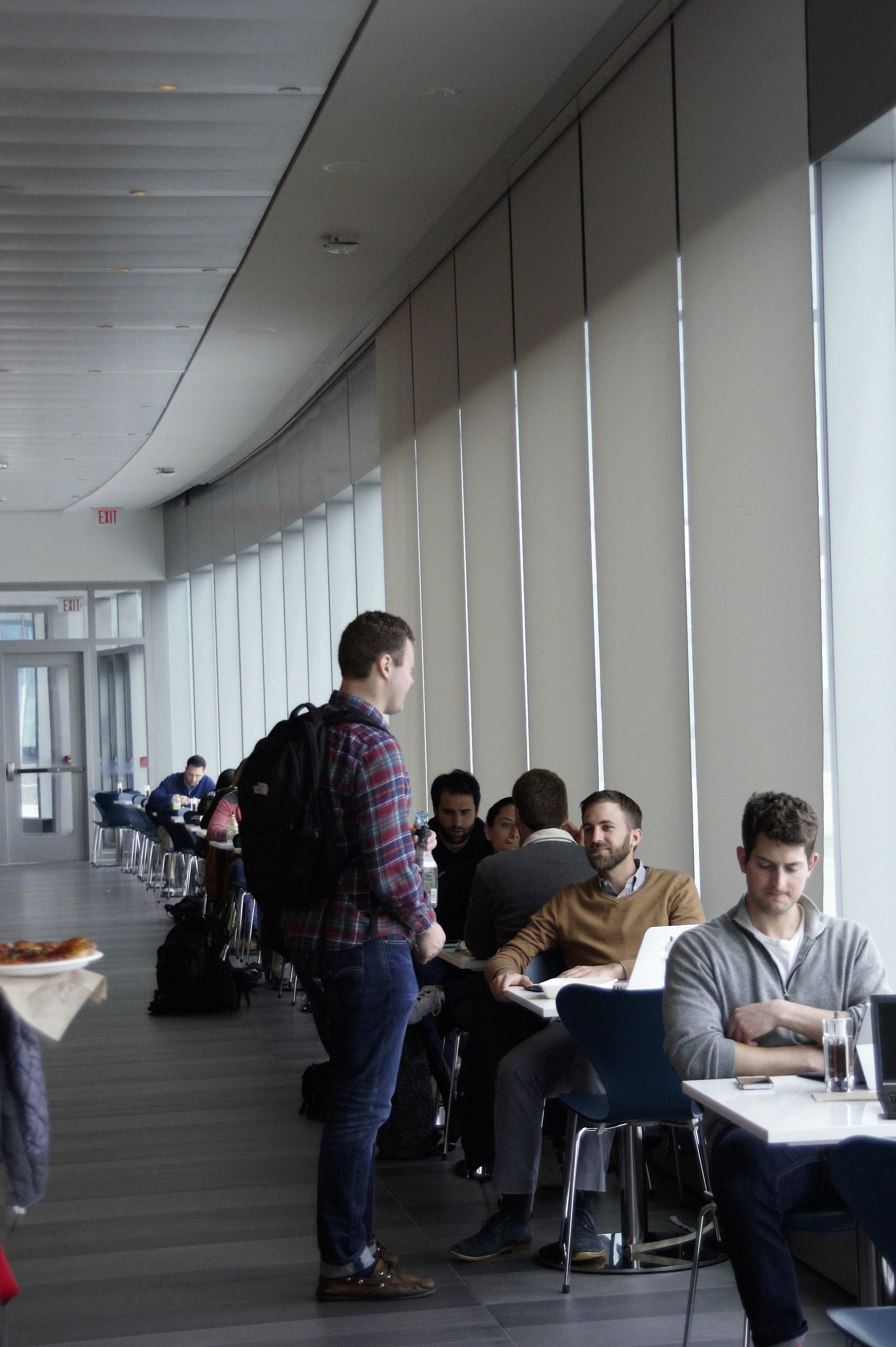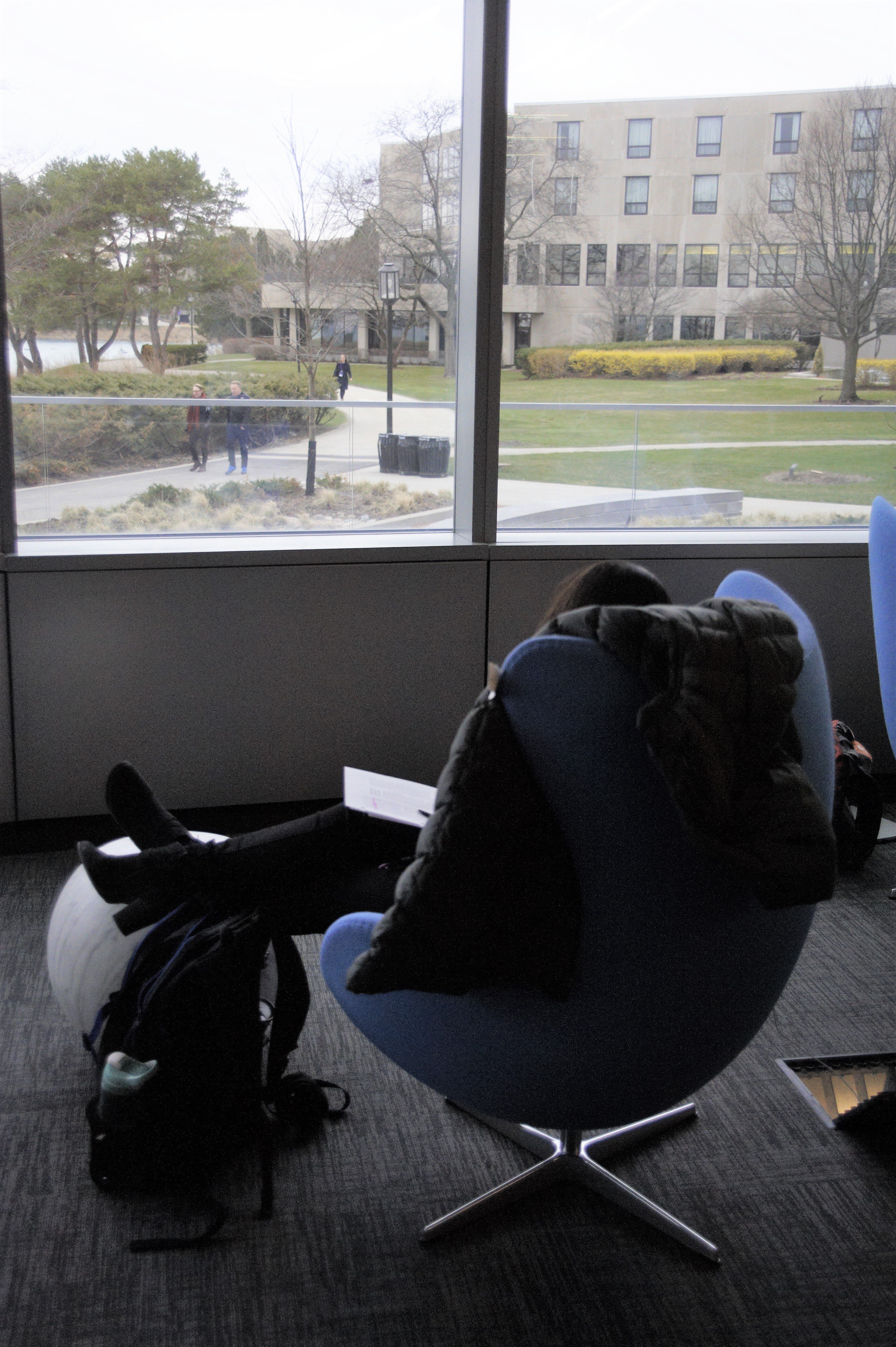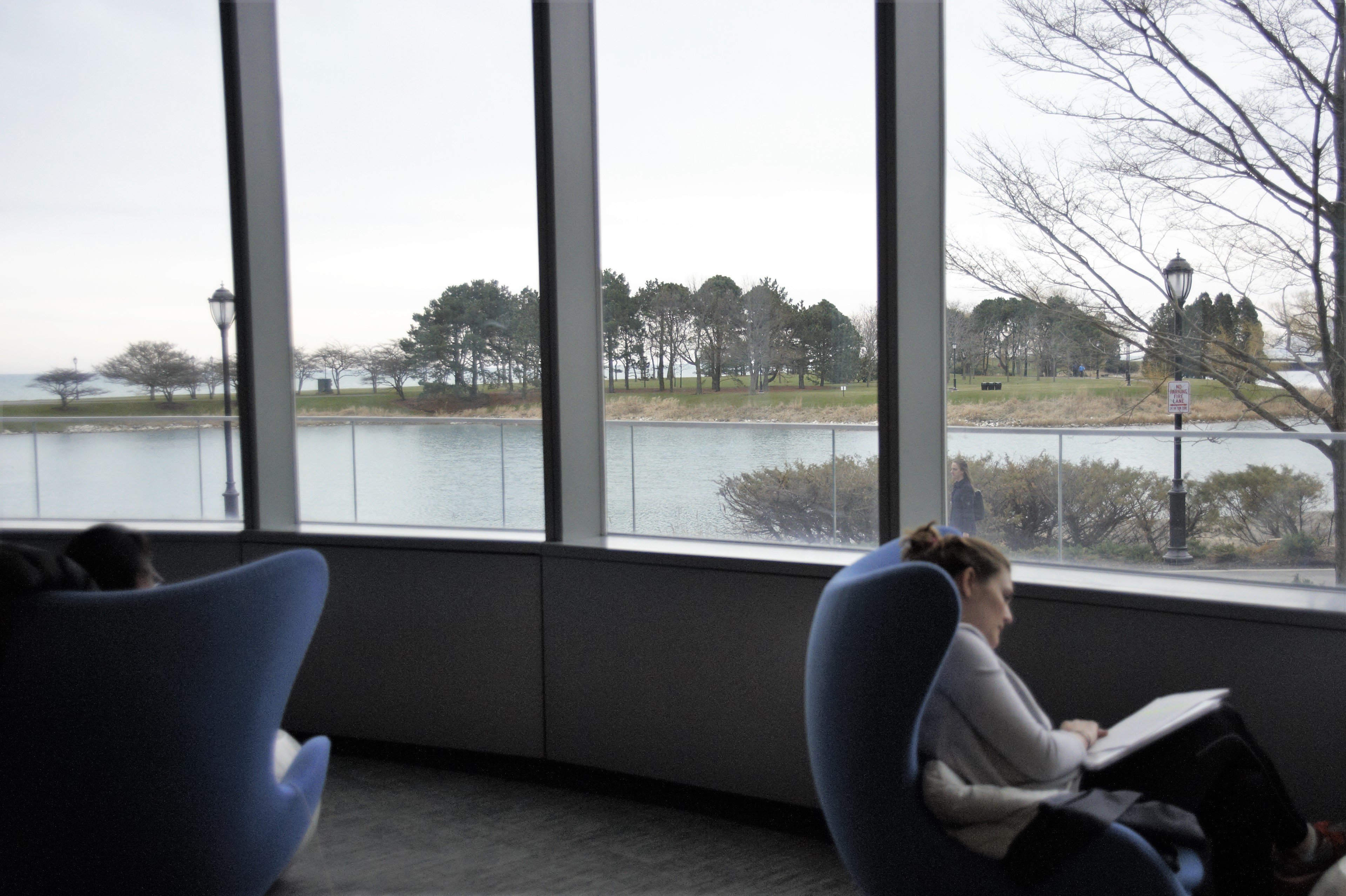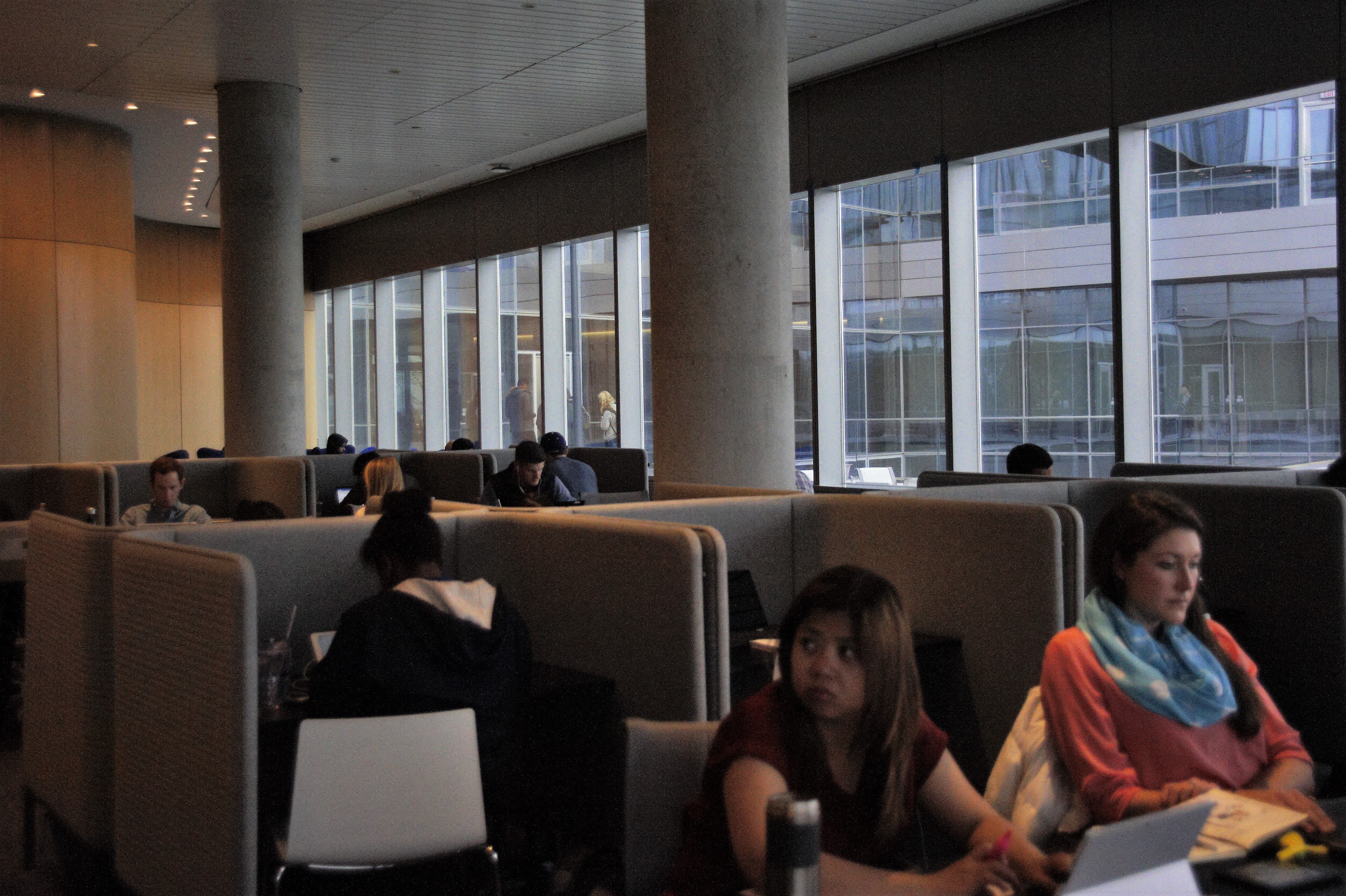 Student lounges provide places to gather, as well as quiet spaces to work.Individual carrels in student lounges provide “heads-down,” quiet working spaces.Picturesque lake views surround the student lounges.Abundant places to work and study make it easy for students to comfortably spend 10- to 12-hour days at the Global Hub.Dining areas provide casual gathering spaces for students, meal options from morning ’til night.This seating area, adjacent to the cafeteria, is open around the clock and doubles as a student gathering area.
