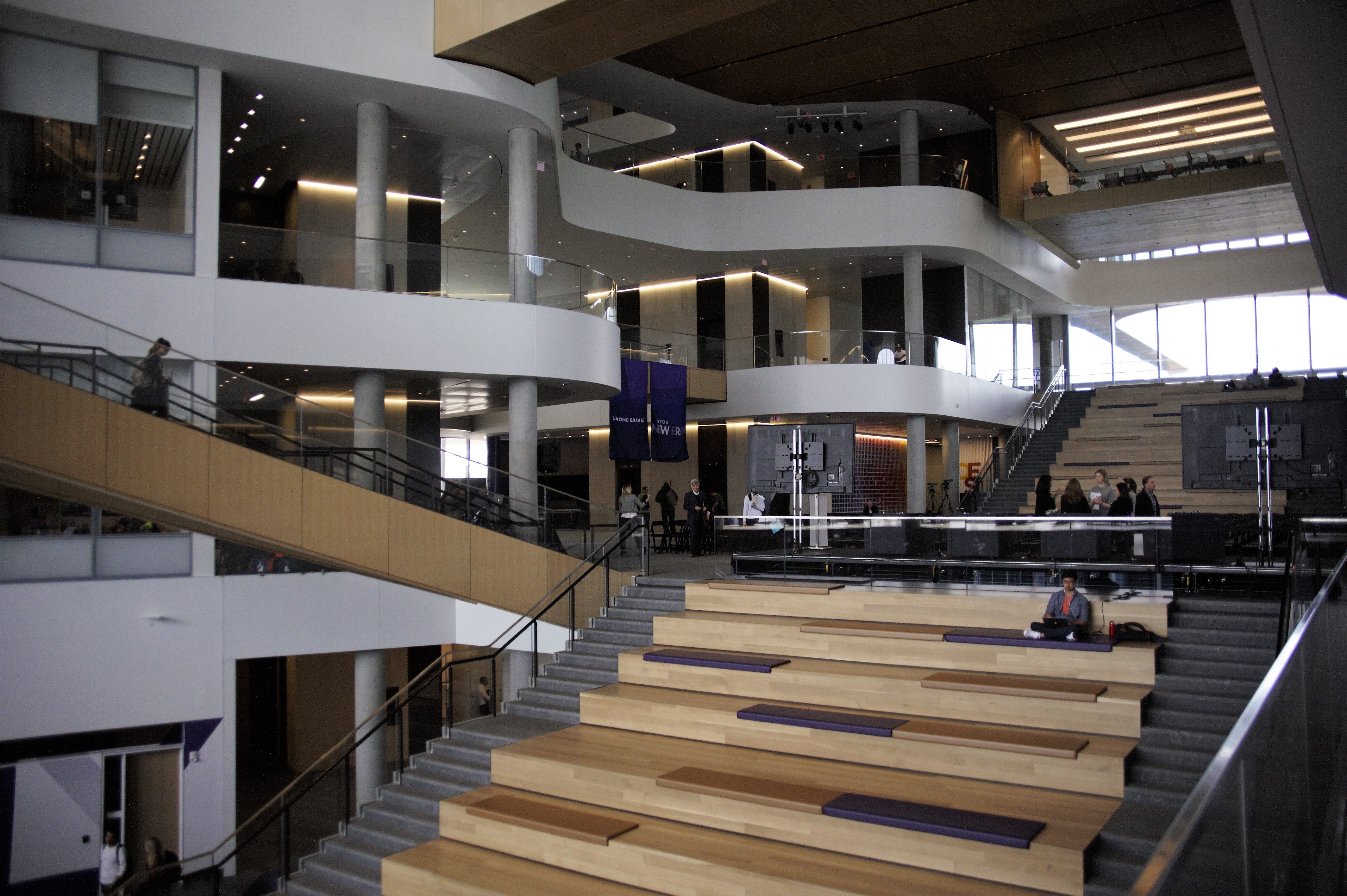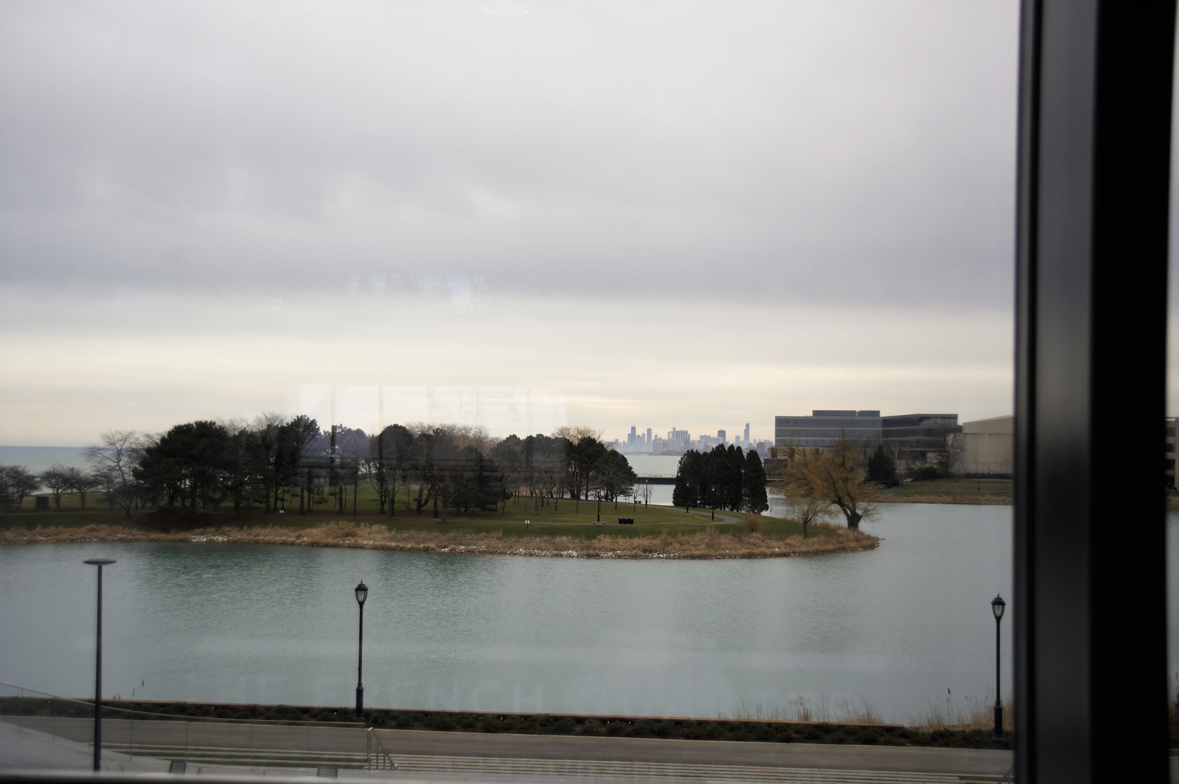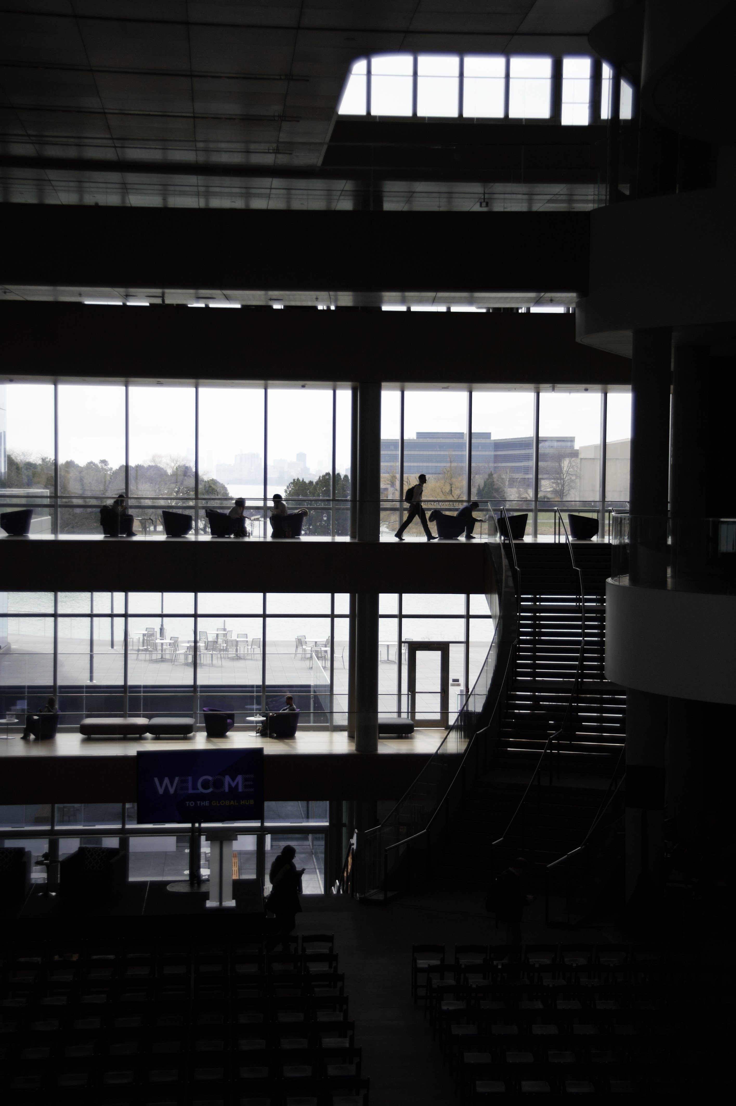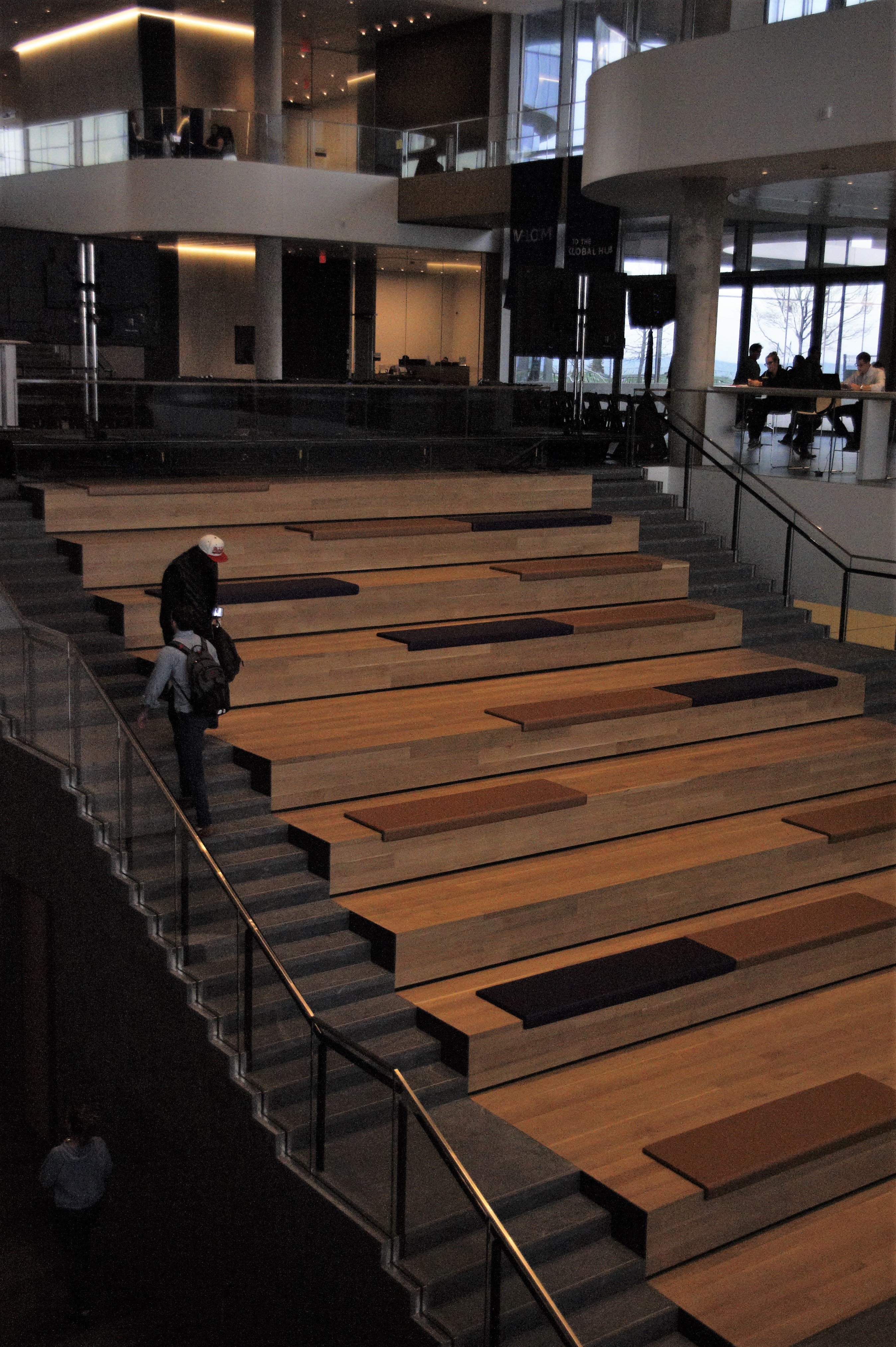 Strategically places courtyards and light courts help bring sunlight into interior building spaces.One of several light courts providing outdoor gathering places while bringing sunlight indoors.Two-story auditorium with retractable seating can accommodate up to 350 people in varying configurations, affording sweeping views of Lake Michigan and downtown Chicago.Spanish Steps