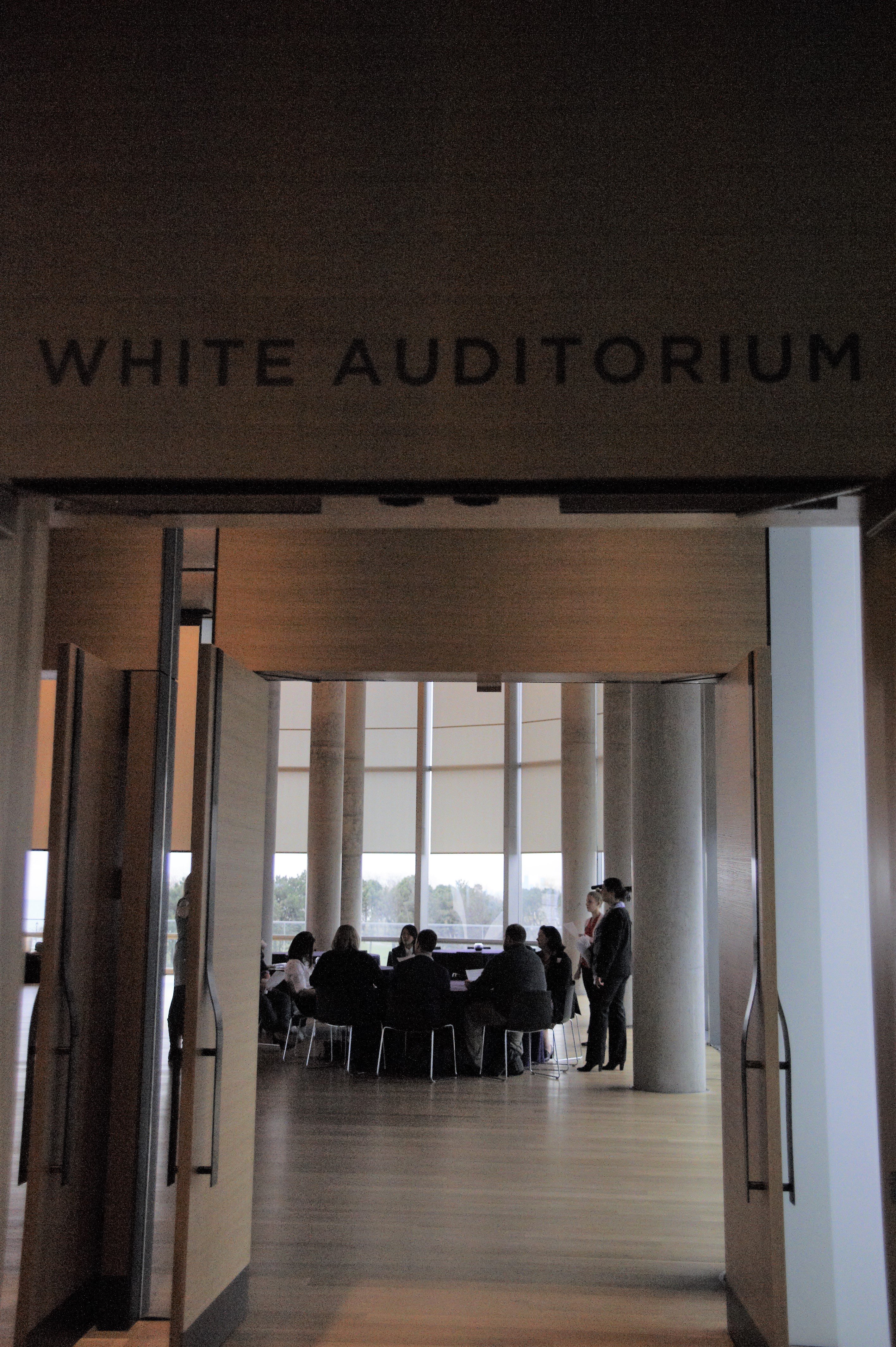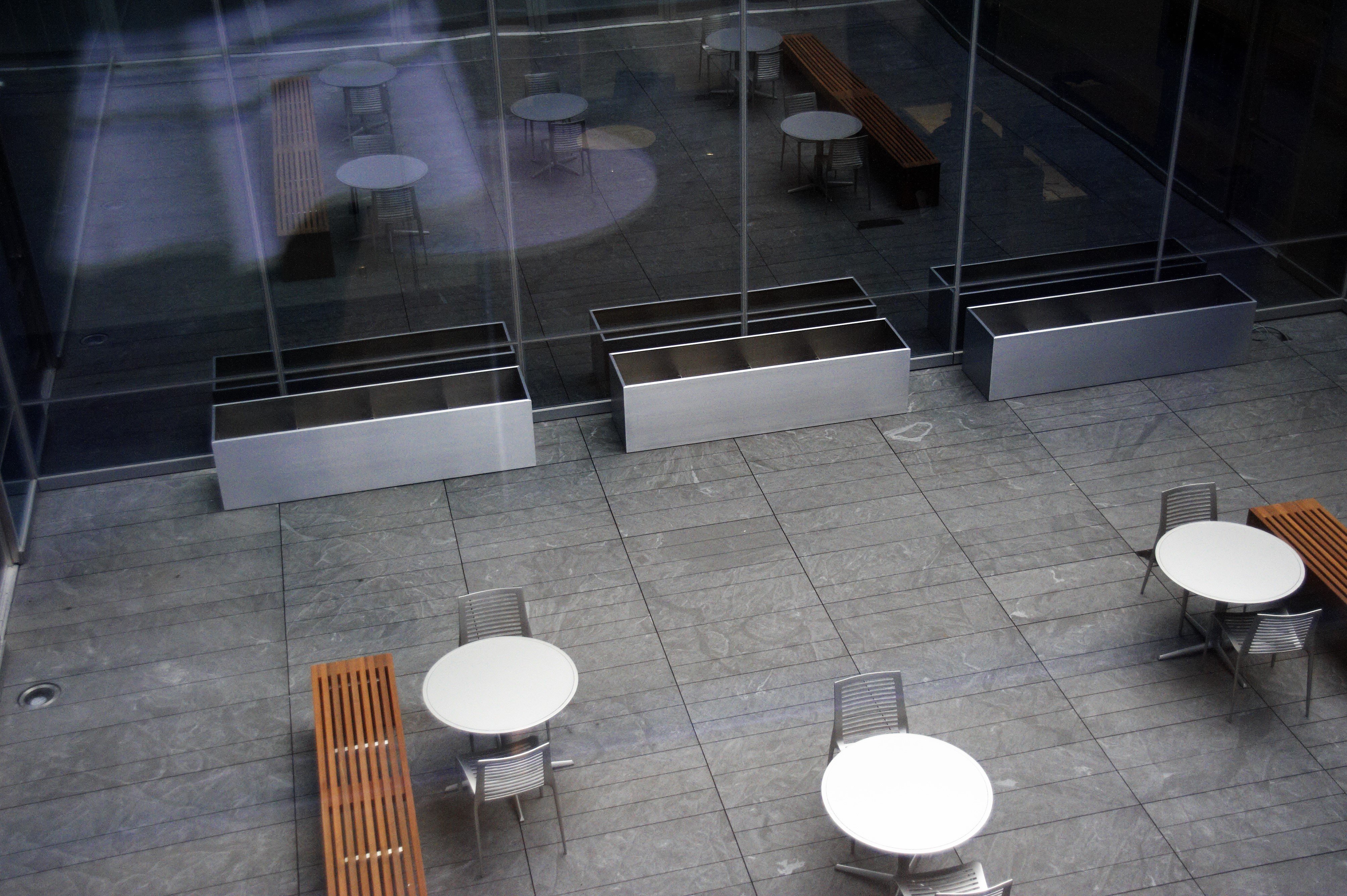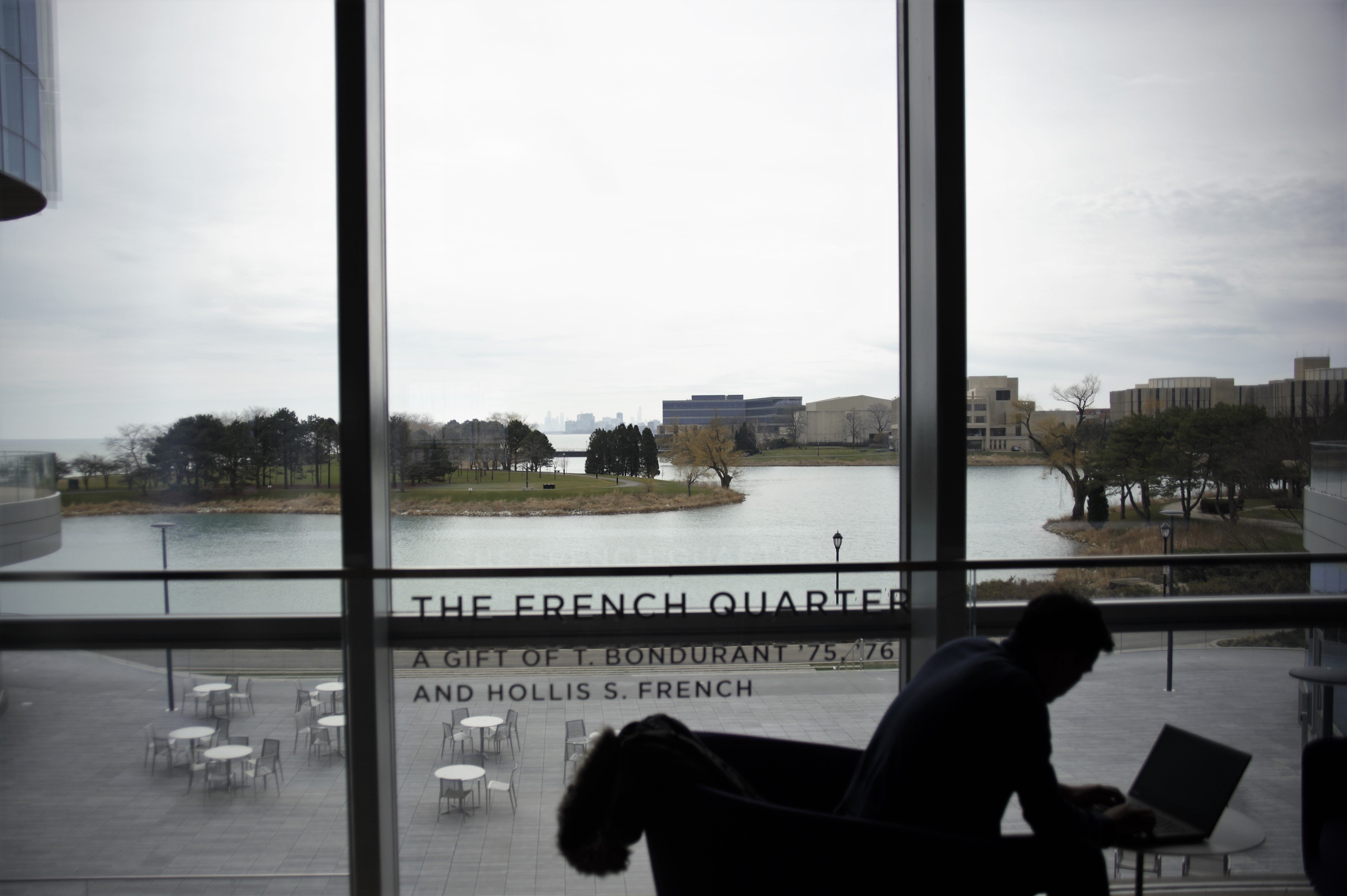 Strategically places courtyards and light courts help bring sunlight into interior building spaces.One of several light courts providing outdoor gathering places while bringing sunlight indoors.Two-story auditorium with retractable seating can accommodate up to 350 people in varying configurations, affording sweeping views of Lake Michigan and downtown Chicago.Spanish Steps