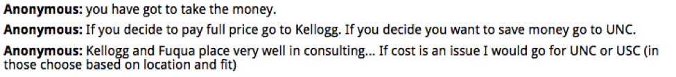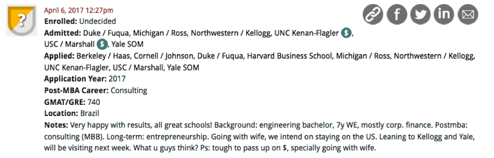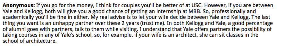 In this edition of MBA DecisionWire Spotlight, which highlights the admissions results of students and alumni posted to Clear Admit’s DecisionWire, we round up responses to a candidate leaning towards Northwestern / Kellogg and Yale School of Management for consulting. Overall, his options include Duke / Fuqua, Michigan / Ross, Northwestern / Kellogg, UNC Kenan-Flagler, USC / Marshall, and Yale SOM, and bringing his wife also factors into the decision.