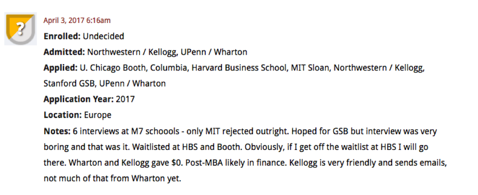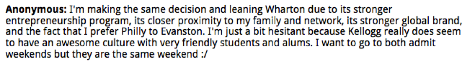 In this edition of MBA DecisionWire Spotlight, which highlights the admissions results of students and alumni posted to Clear Admit’s DecisionWire, we round up responses to a candidate trying to choose between Northwestern / Kellogg and UPenn / Wharton for finance. This week, a candidate with acceptances to Kellogg and Wharton, but also a few waitlist placements, reached out on DecisionWire.