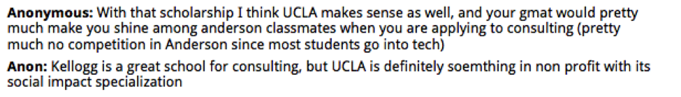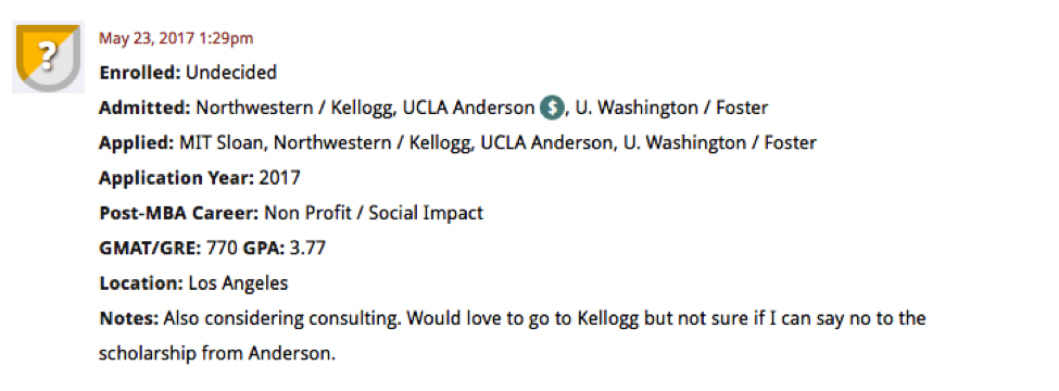 In another installment of MBA DecisionWire Spotlight, which highlights MBA candidates’ choices as shared in Clear Admit’s DecisionWire, we take a closer look at a candidate’s choice among Northwestern / Kellogg, UCLA / Anderson or U. Washington / Foster for social impact. The offer from UCLA / Anderson came with a scholarship as well.
