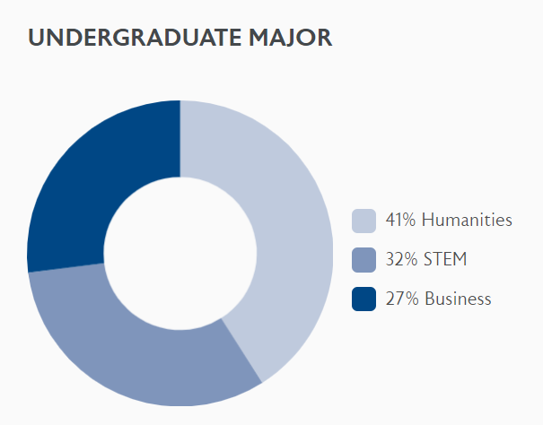 Perhaps the most notable shift in this year’s incoming class was the growth in students who were STEM majors in college. Almost a full third of the Class of 2019—32 percent—have STEM degrees, up from 28 percent last year and just 25 percent the year before. Students with business degrees make up 27 percent, meanwhile, and humanities majors make up the remaining 41 percent, off from last year’s 46 percent.
