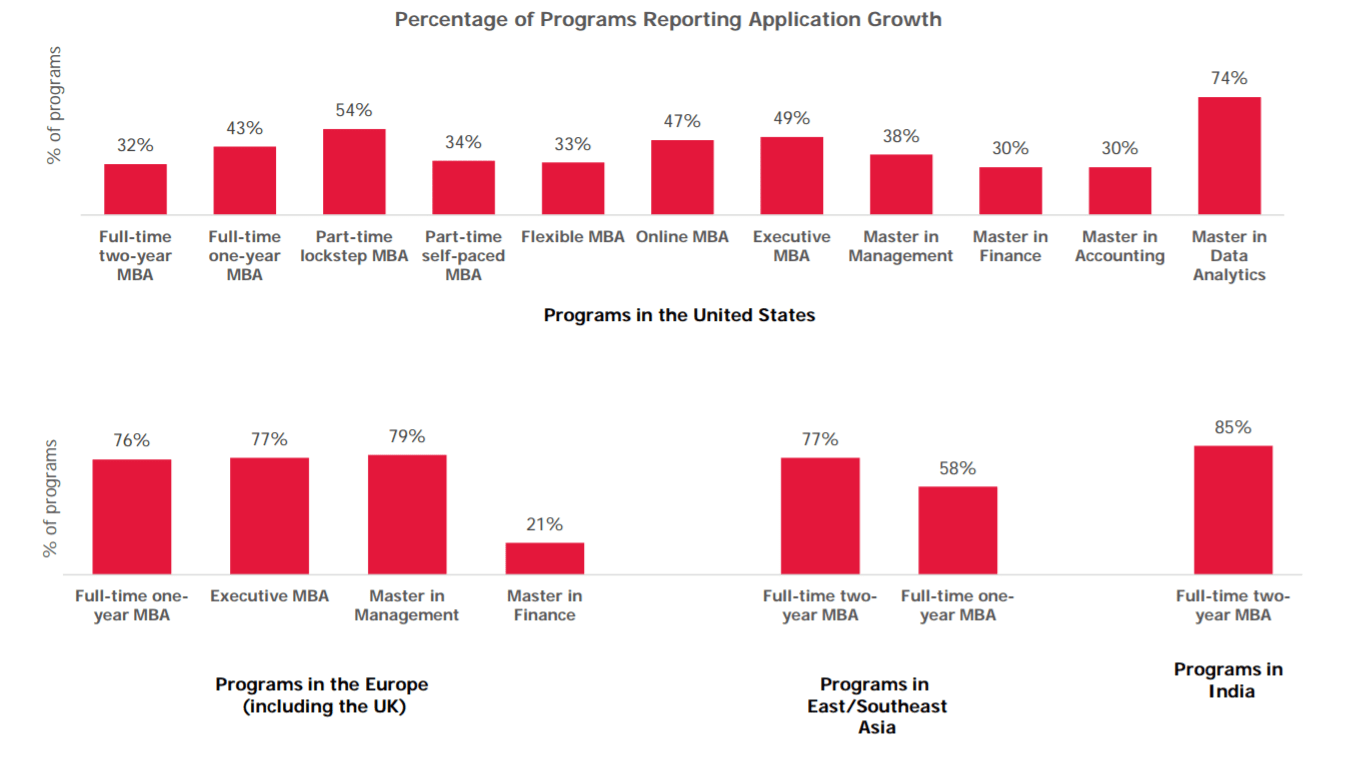 Elsewhere in the world—including in Europe, East and Southeast Asia, and India—business schools had a very different story to tell. In each of these regions, the vast majority of programs saw application volume increases. In Europe, 76 percent of one-year, full-time MBA programs saw growth; in East and Southeast Asia, 77 percent of full-time, two-year MBA programs saw growth; and in India, 85 percent of full-time, two-year MBA programs reported increased application volume.