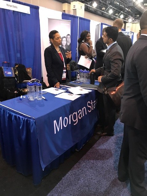 The Career Expo, which took place on the last two days of the five-day National Black/Prospanica conference, filled a cavernous hall in the Convention Center and included booths from close to 300 companies spanning dozens of industries. Among them were coveted post-MBA tech employers like Google and Amazon, consulting industry leaders including Bain & Company and Accenture, and financial services firms such as BlackRock, Bank of America, and Morgan Stanley. There was a continuous gaggle at the Google booth, and one of its MBA internship recruiters, Tanya Choudhury, had to resort to wearing a sign by the second day explaining that she’d lost her voice.
