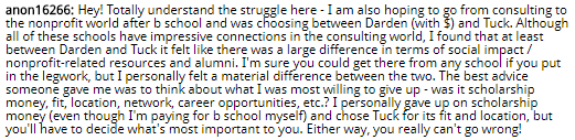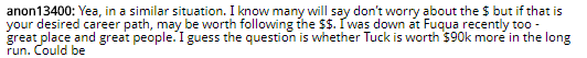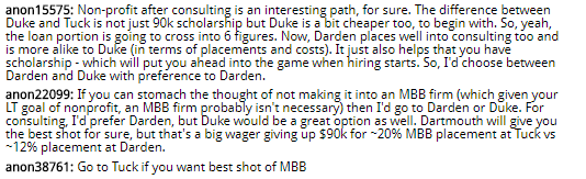 In this week’s MBA DecisionWire Spotlight, which highlights MBA candidates’ choices as shared in Clear Admit’s DecisionWire, we round up responses to a candidate considering Cornell / Johnson, Dartmouth / Tuck, Duke / Fuqua, and UVA / Darden for consulting with some scholarship funding.