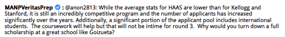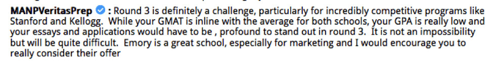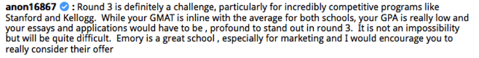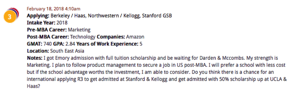 As prime deadlines for this season pass, many are sharing their stories and concerns on ApplyWire, Clear Admit’s latest tool to aid in your admissions process. This week, since ApplyWire is also a place to receive advice, we’re setting the spotlight on a candidate considering applying in Round 3. We take a closer look at a post from an applicant with admission to Emory / Goizueta and waiting to hear from UVA / Darden and UT Austin / McCombs, but also potentially targeting Berkeley / Haas, Northwestern / Kellogg, and Stanford GSB in Round 3. Read on for more details about the candidate’s background.