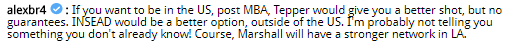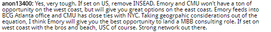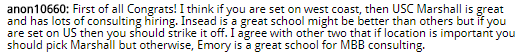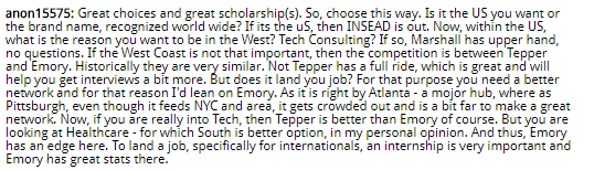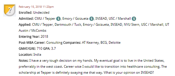 In this edition of MBA DecisionWire Spotlight, which highlights MBA candidates’ choices as shared in Clear Admit’s DecisionWire, we take a closer look at a candidate considering CMU / Tepper, Emory / Goizueta, INSEAD, or USC / Marshall for consulting with some scholarship funding.