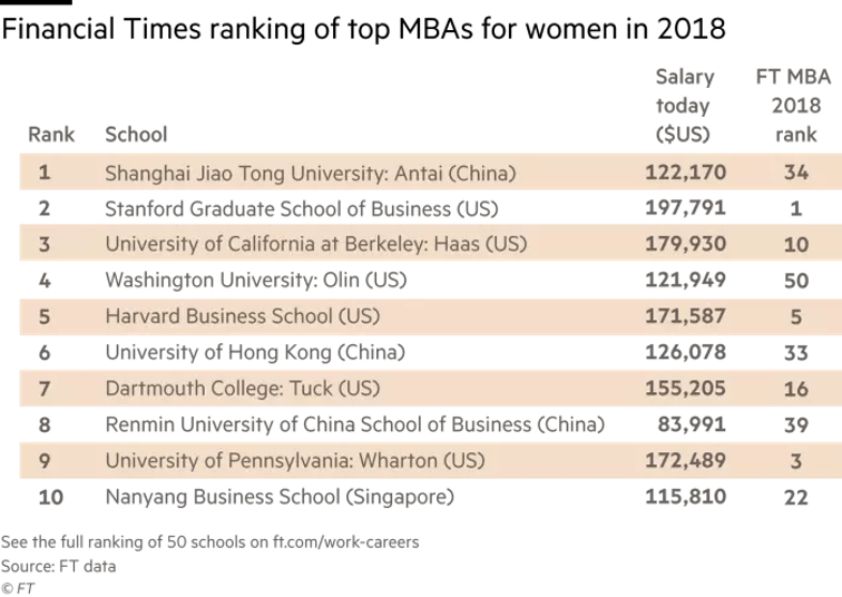 It’s for precisely these reasons that the Financial Times decided to create a new Global MBA ranking specifically for women. The FT Top MBAs for Women Ranking 2018, published earlier this week, reviews MBA programs based on which are most beneficial to women in terms of ensuring that their investment will pay off. It examines aspects ranging from how an MBA program helps its female graduates overcome pay discrimination to which schools are best at teaching and developing their female MBA students. This new ranking only looks at a school’s outcome for women—not for men—resulting in a top-10 list that differs markedly from the FT‘s own Global MBA ranking, published in January.