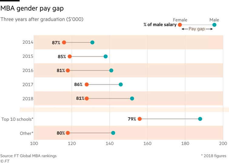 That’s because the FT‘s Global MBA ranking doesn’t measure whether women do as well as their male counterparts upon graduation. This new ranking takes a harder look at business schools specifically in term of their outcomes for women. This approach allowed the FT to identify both the schools where women perform best and the schools where the disparity between men and women’s success is greatest.
