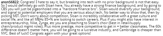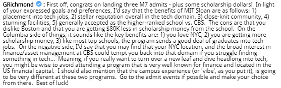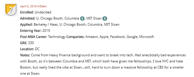 In this edition of MBA DecisionWire Spotlight, which highlights MBA candidates’ choices as shared in Clear Admit’s DecisionWire, we take a closer look at a candidate accepted to U. Chicago Booth, Columbia, MIT / Sloan for technology with some scholarship funding. The candidate laid out their criteria in the initial post: