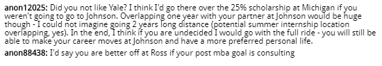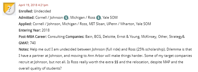 For this edition of MBA DecisionWire Spotlight, which highlights MBA candidates’ choices as shared in Clear Admit’s DecisionWire, we take a closer look at a candidate torn between Cornell / Johnson and Michigan / Ross with a plan to enter consulting. The candidate added some more detail in the initial post: