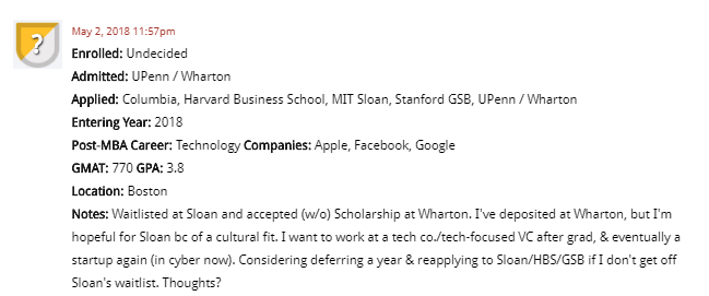 In this MBA DecisionWire Spotlight, which highlights MBA candidates’ choices as shared in Clear Admit’s DecisionWire, we take a closer look at a waitlisted candidate at MIT Sloan, but with an acceptance letter from UPenn / Wharton. The candidate explained the situation in the initial post: