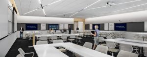 with partial green roofs, access to daylight, and external walkways. It provides small clusters of seating and multi-function nooks and gathering spaces throughout, as well as team-based and active-learning workrooms to facilitate connection and collaboration. The building also exceeds LEED-certification guidelines.