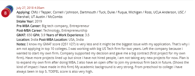 Our next candidate is targeting CMU / Tepper, Cornell / Johnson, Dartmouth / Tuck, Duke / Fuqua, Michigan / Ross, UCLA Anderson, USC / Marshall, UT Austin / McCombs for an MBA: