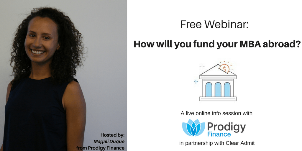 Do you have questions about how you can fund your MBA abroad? Sign up for a live online info session with Prodigy Finance in partnership with Clear Admit to learn about how to finance your studies with a Prodigy Finance international student loan.