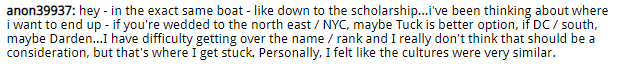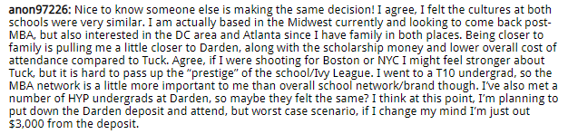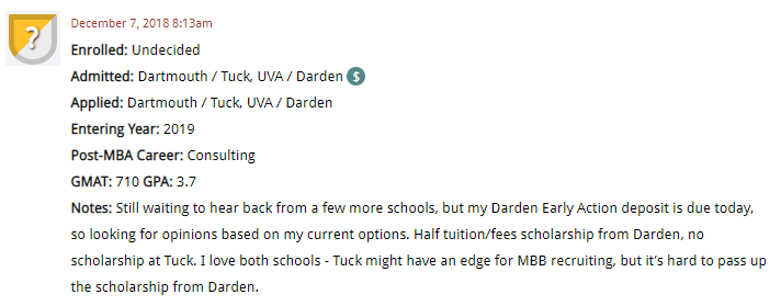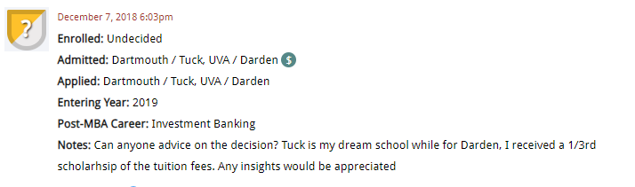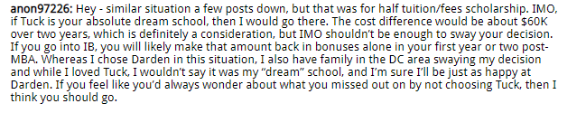 In this MBA DecisionWire Spotlight, which highlights MBA candidates’ choices as shared in Clear Admit’s DecisionWire, we take a closer look at candidates considering their options and scholarship funding. Our first candidate summarized his choice between Dartmouth / Tuck and UVA / Darden: