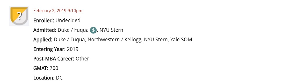 Fellow Clear Admit admission expert, Graham Richmond, also weighed in, taking careful consideration of the scholarship advantage the original poster has with Duke / Fuqua, as well as important inquiries they made regarding the community and career potential. Another community member also chimed in, agreeing with Richmond’s sentiments: