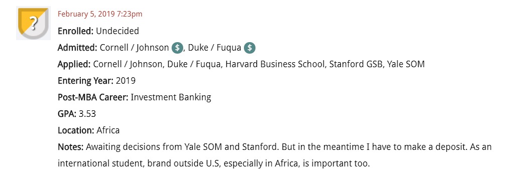 Just a few days later, another MBA candidate accepted to Duke / Fuqua, as well as Cornell / Johnson, inquired about which school could be better for investment banking and international brand recognition:
