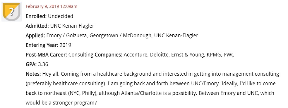 With a hopeful career in healthcare consulting, OP seemed undecided about enrolling in UNC Kenan-Flager or Emory / Goizueta, concerned with which Southeast school offered a better potential career in “Pharma/biotech.” Alex Brown assured that both options were very comparable, and that the choice should likely come down to fit: