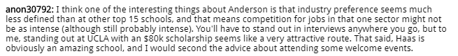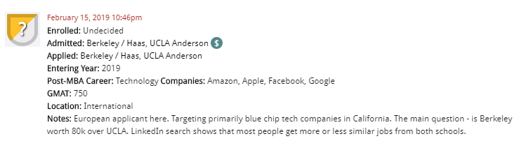 In this MBA DecisionWire Spotlight, which highlights MBA candidates’ choices as shared in Clear Admit’s DecisionWire, we take a closer look at a candidate accepted to Berkeley / Haas and UCLA Anderson. The candidate is interested in tech and also received a scholarship offer, worth $80k, from UCLA / Anderson.