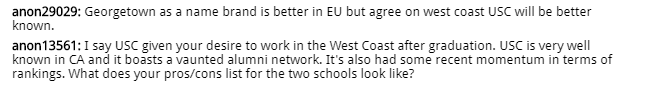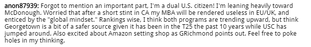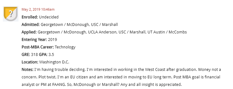 In this MBA DecisionWire Spotlight, which highlights MBA candidates’ choices as shared in Clear Admit’s DecisionWire, we take a closer look at a candidate interested in tech and accepted to Georgetown / McDonough and USC / Marshall.