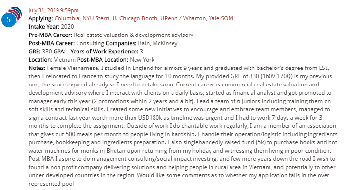 As applicants consider what business schools to shortlist, many are posting to Clear Admit’s MBA ApplyWire, an admissions tool for feedback on candidacy, school choice and more. This week, we take a closer look at an MBA hopeful applying to Columbia, NYU Stern, U. Chicago Booth, UPenn / Wharton, and Yale SOM. Read on for the details.