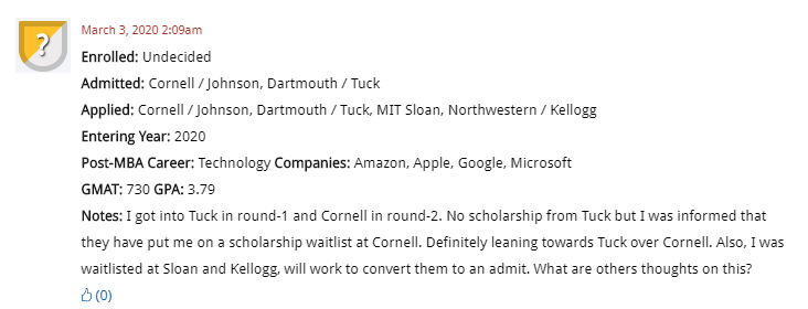 On DecisionWire, an accepted MBA candidate needs help weighing their options: