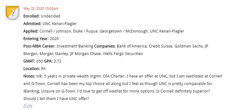 An undecided candidate has been accepted to UNC Kenan-Flagler, but is also looking into other options: