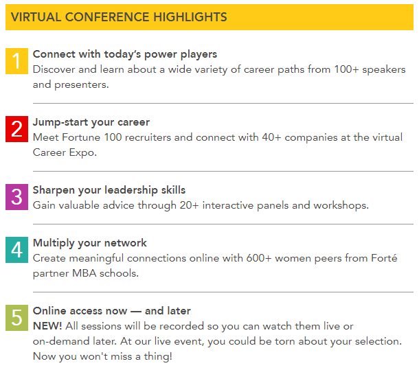 Over 1,600 people attended the Forté Foundation’s annual MBA Women’s Leadership Conference, which ran June 12th and 13th this year. Held virtually for the first time in Forté’s history, the event set an attendance record with more than double the attendance of 2019’s sold-out conference. As a non-profit dedicated to advancing women in business, Forté Foundation hosts the conference to connect women looking to enroll in a Forté partner school MBA program with business leaders, MBA alumnae, experts, and representatives of Forté’s partners. The conference highlighted community, empowerment, and confidence for women ready to pursue an MBA as the first step in their careers.