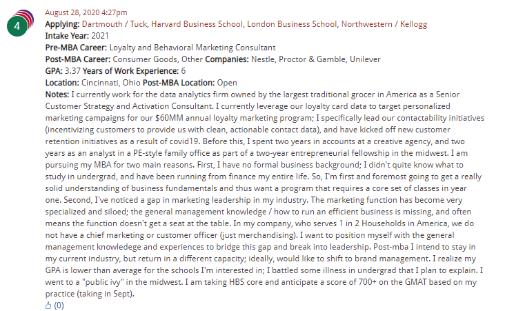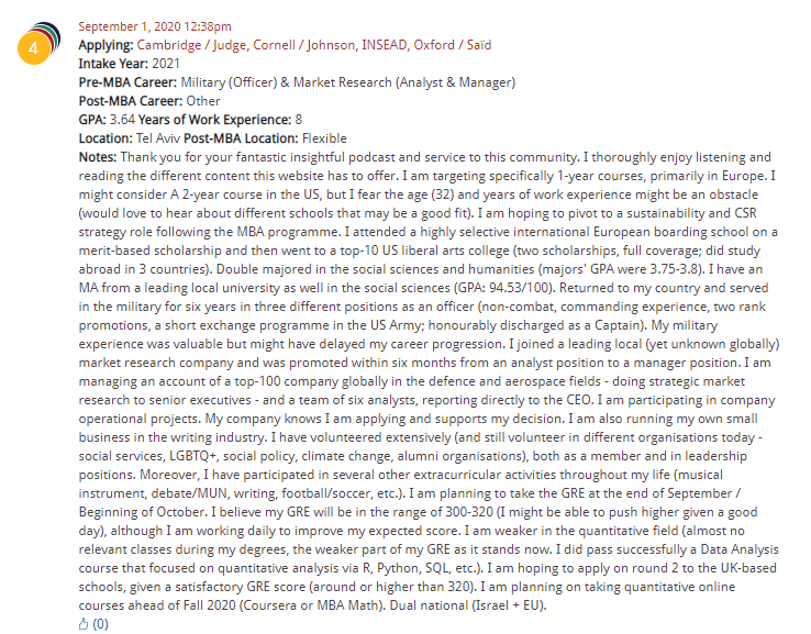 As MBA applicants set their sights on becoming members of the Class of 2023, our admissions experts, Graham Richmond and Alex Brown, continue to offer strategic advice to those who have posted in MBA ApplyWire. Preview the candidates they discuss below, then tune into this week’s podcast episode of Wire Taps.