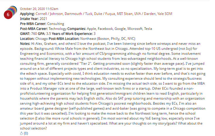 Be sure to post to MBA ApplyWire or MBA DecisionWire if you’d like Graham and Alex to offer admissions advice.