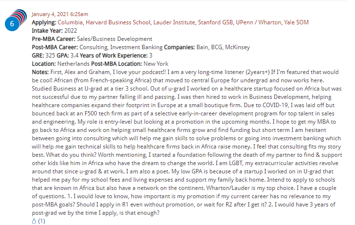 Be sure to post to MBA ApplyWire or MBA DecisionWire if you’d like Graham and Alex to offer admissions advice.
