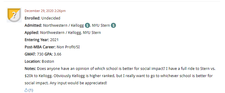 Finally, the third profiled candidate needs help choosing between Northwestern Kellogg and NYU Stern for social impact: