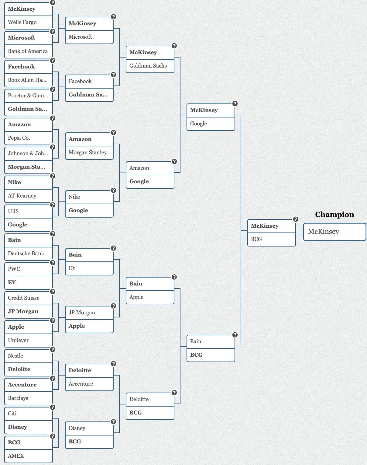 While users voted for their favorite Post-MBA Employers, Clear Admit joined in on the fun and made a prediction bracket of our own. Richmond notes, “Of course, before we let site visitors kick off voting in the competition, we couldn’t help but run some predictions based on historic preferences among registered users on clearadmit.com.”