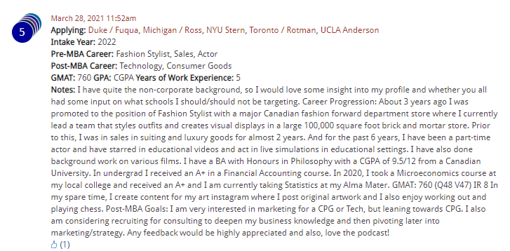 Another MBA hopeful from an atypical industry sought advice on their profile cohesion: