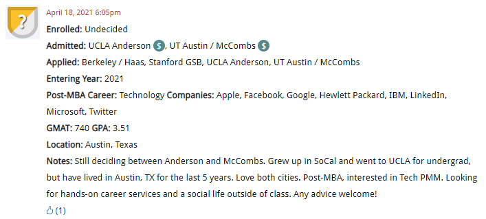 Finally, an accepted candidate is torn between Texas McCombs and UCLA Anderson for tech:
