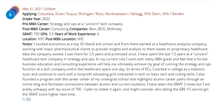 In regards to profiles this week, the first MBA hopeful comes from a “unicorn” healthcare tech company in strategy and ops, and has already taken the GMAT three times: