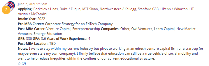 Next, another MBA applicant is looking to make the tough jump to venture capital from EdTech: