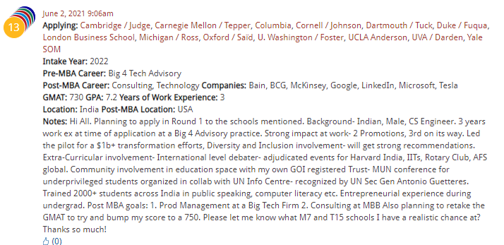 Finally, a tech applicant from India requested an assessment of his chances at the M7 and Top 15 schools: