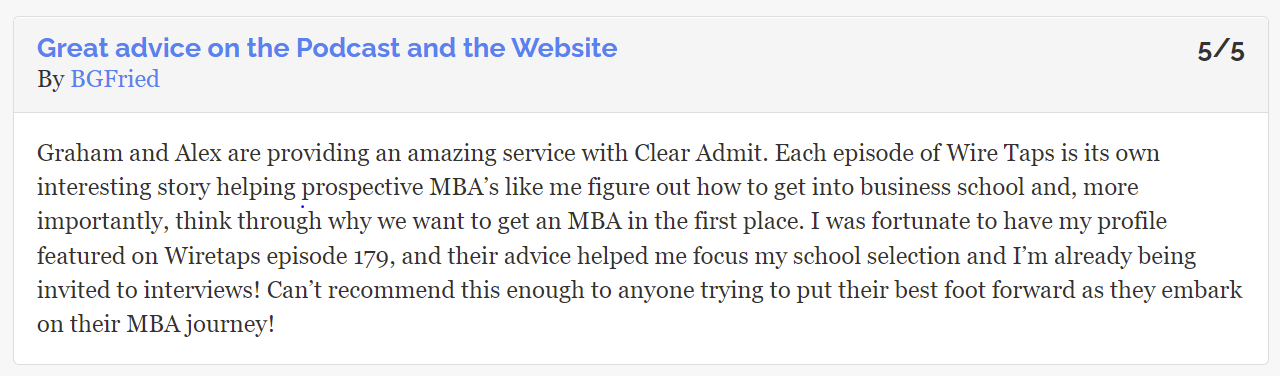 - REAL HUMANS: Our “WireTaps” episodes, which air each Monday, have profiled over 370 real MBA candidates, using a case-method approach to help our listeners understand MBA admissions strategy.