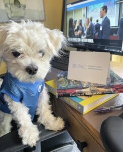 My husband and I (like many millennials) adopted a Maltese puppy, named Louis, in the middle of the lockdown last year. He is the absolute baby of the family and enjoys repping the Tar Heel jersey (very well)!